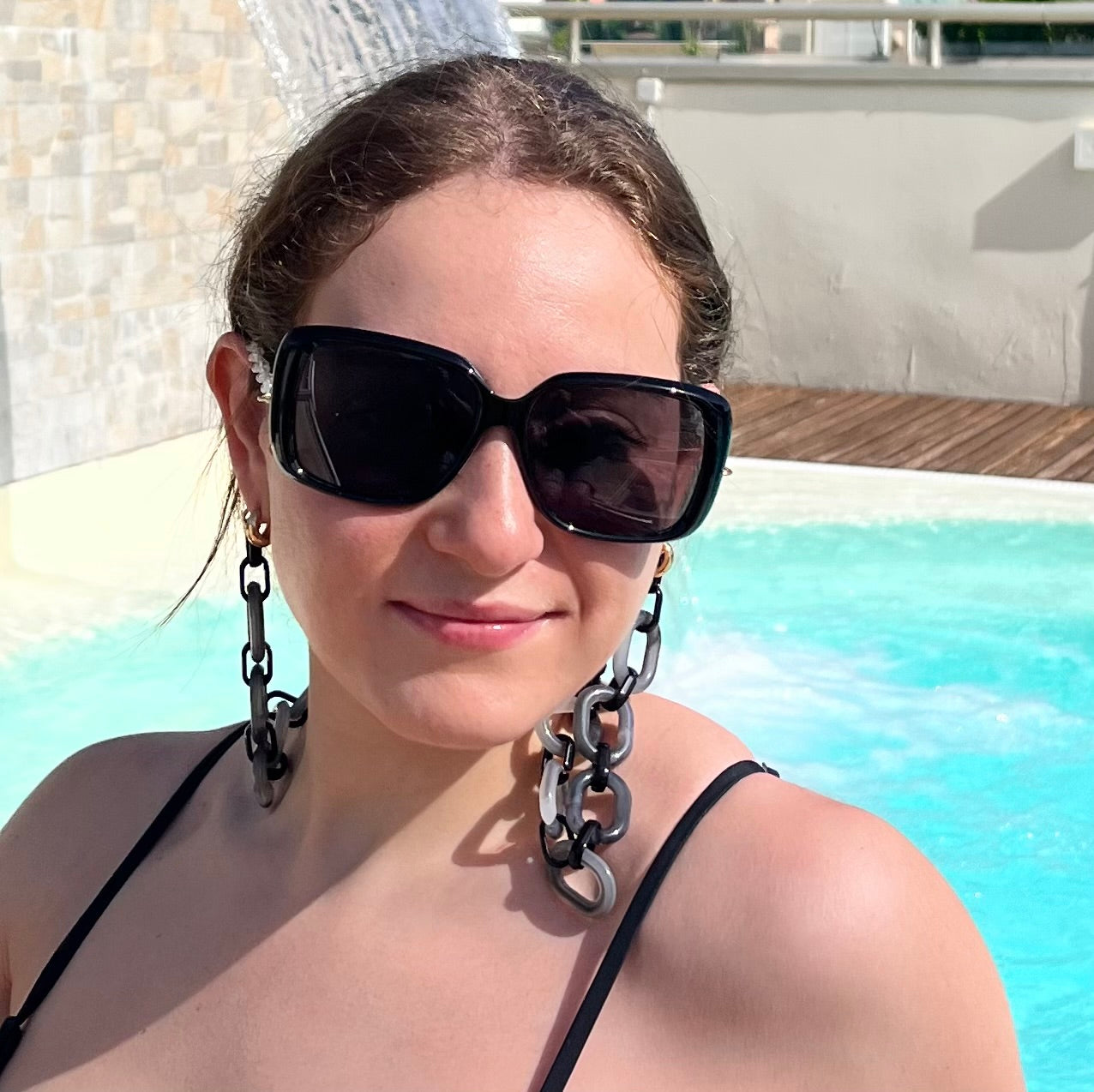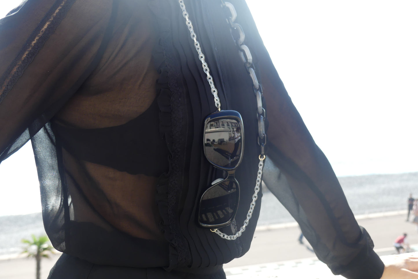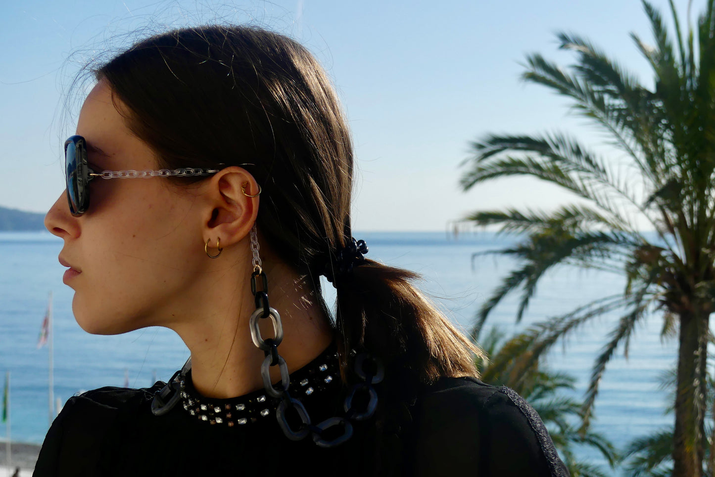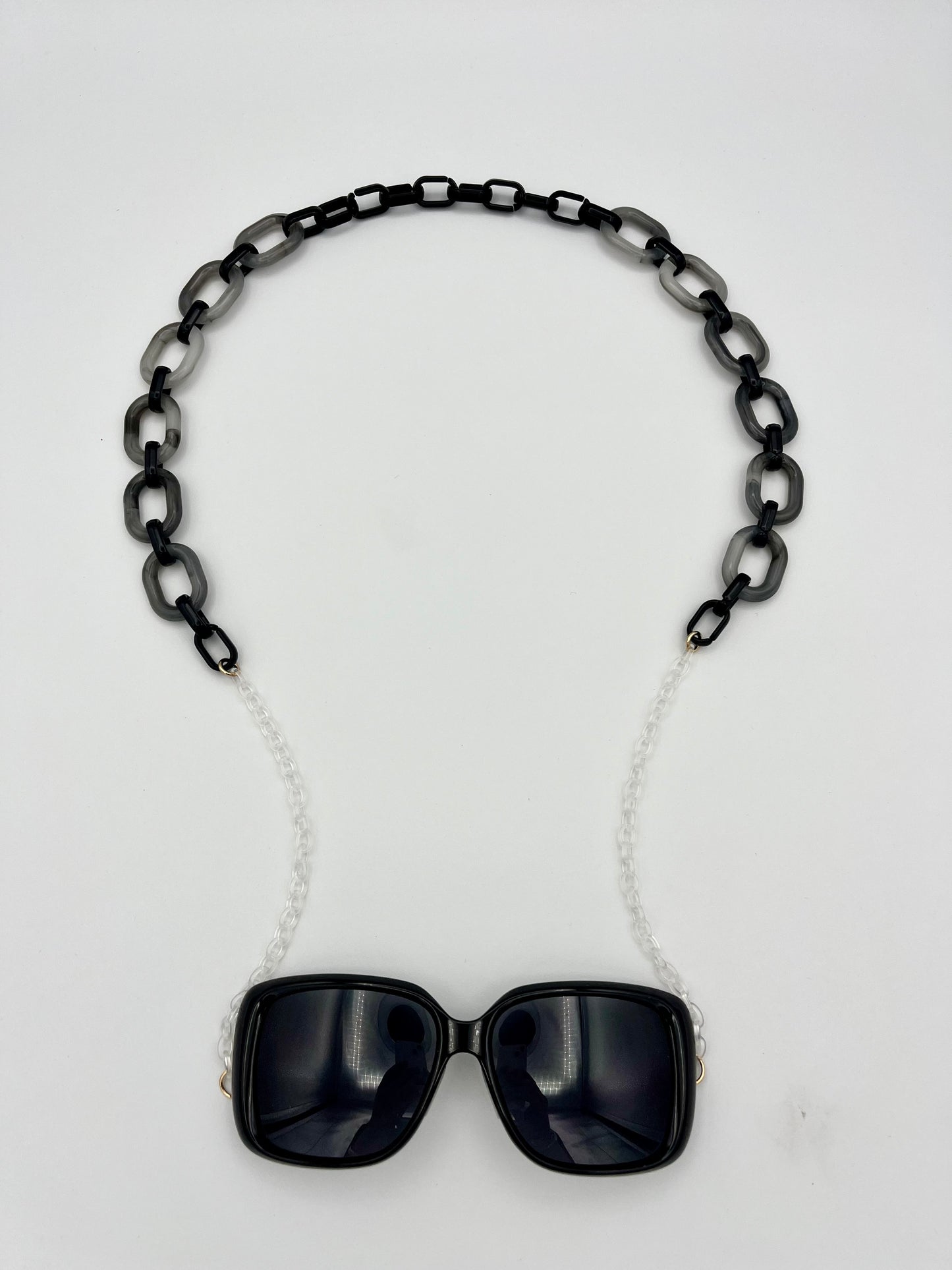 Les chaînettes transparentes se placent derrière les oreilles et s'adaptent à toutes les morphologies de visage, le collier bi-color noir et gris ajoute une dimension mode subtile. Vous pouvez porter vos lunettes en collier dès que vous passez à l'ombre, et leur maintien parfait vous permettra de les garder sans souci toute la journée.